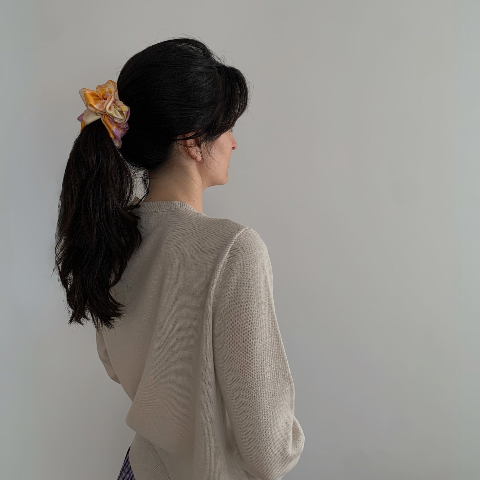 This beautiful scrunchie has been upcycled from a vintage Nina Ricci 100% silk scarf.
