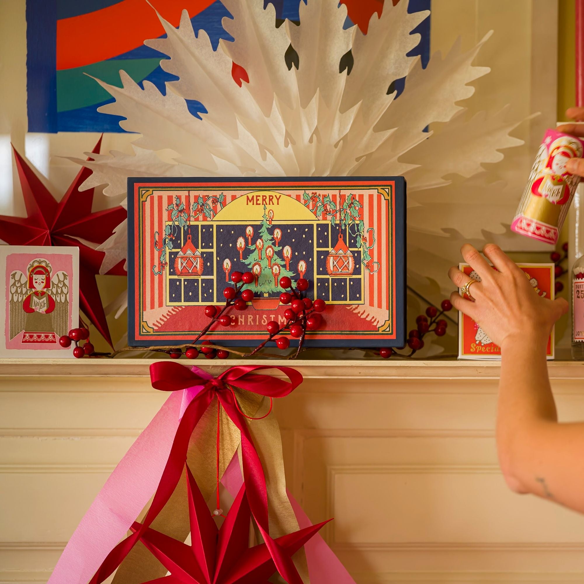 Our giant matches featuring a festive scene with a decorated Christmas tree in front of a big open window with the words 'Merry Christmas.'