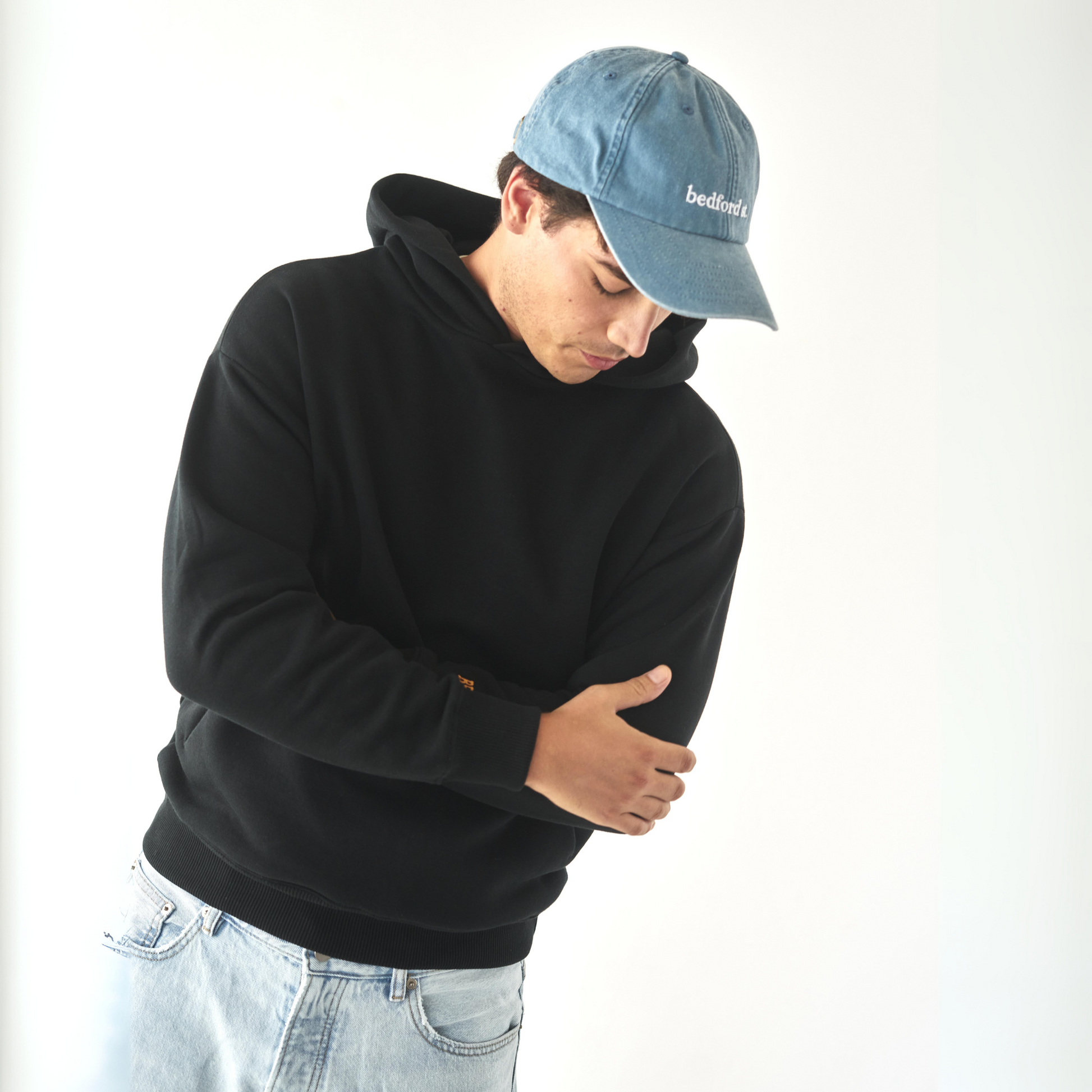 Made of 100% washed cotton, in light blue color. Adjustable brass buckle strap and embroidered logo in white.