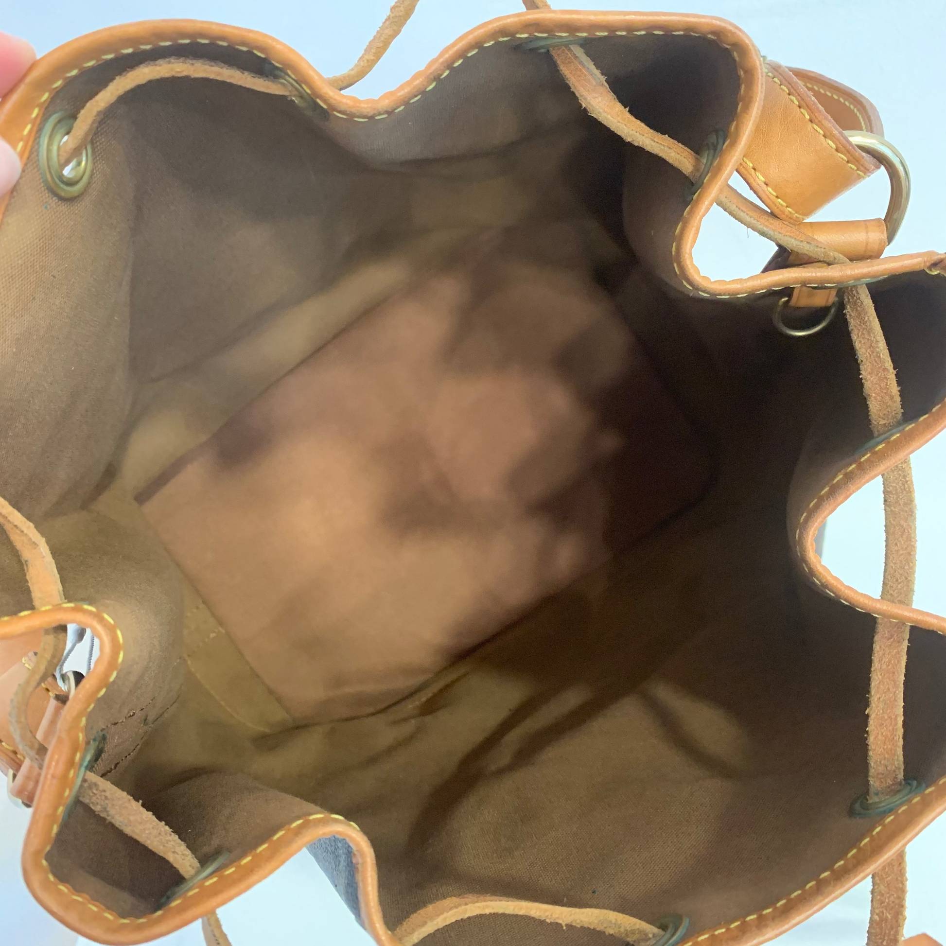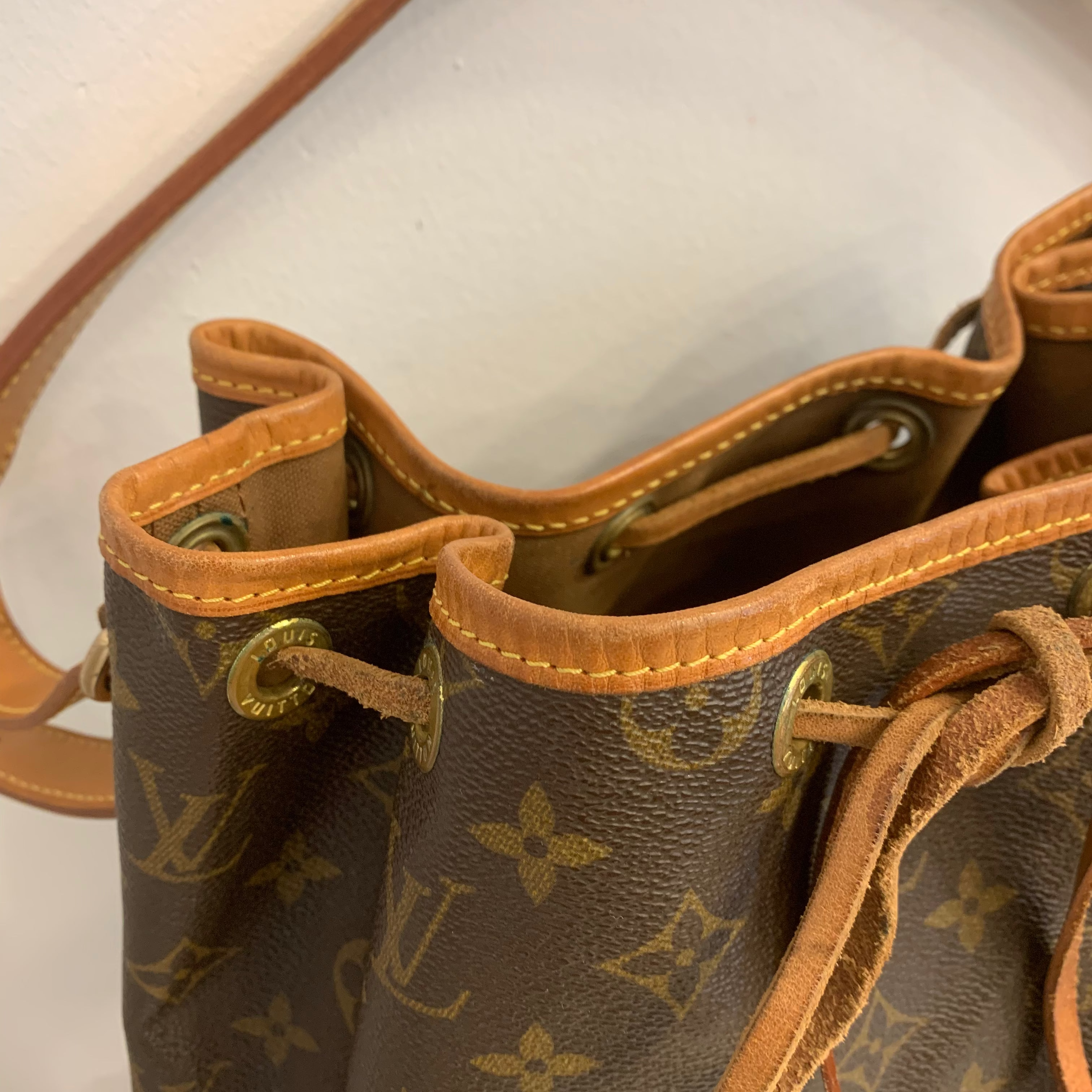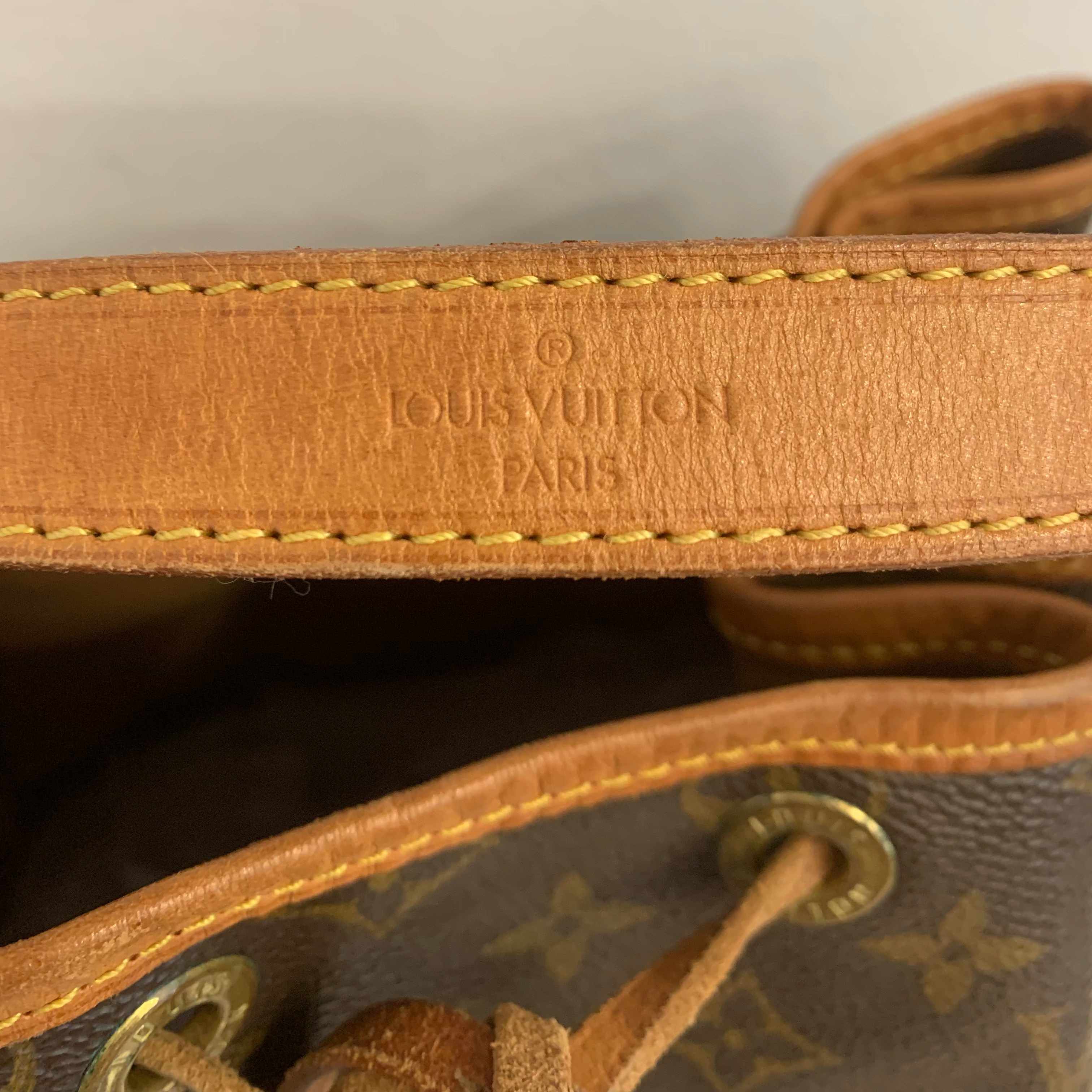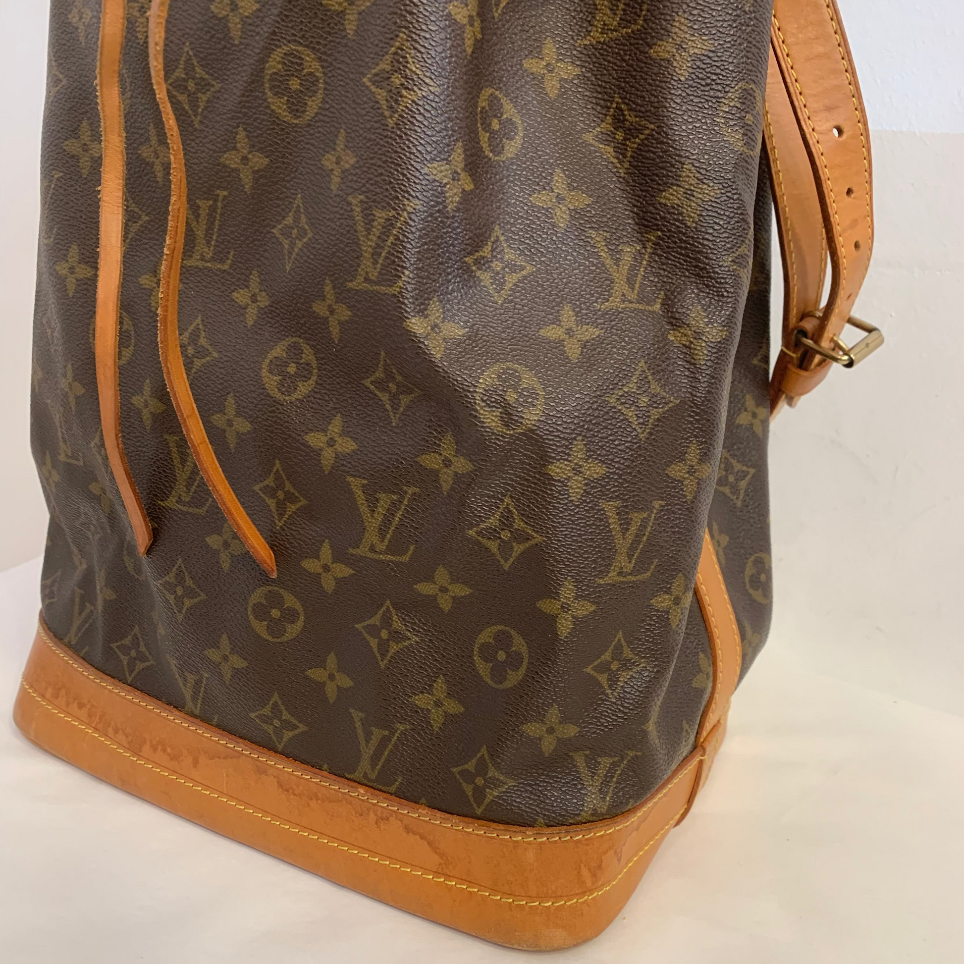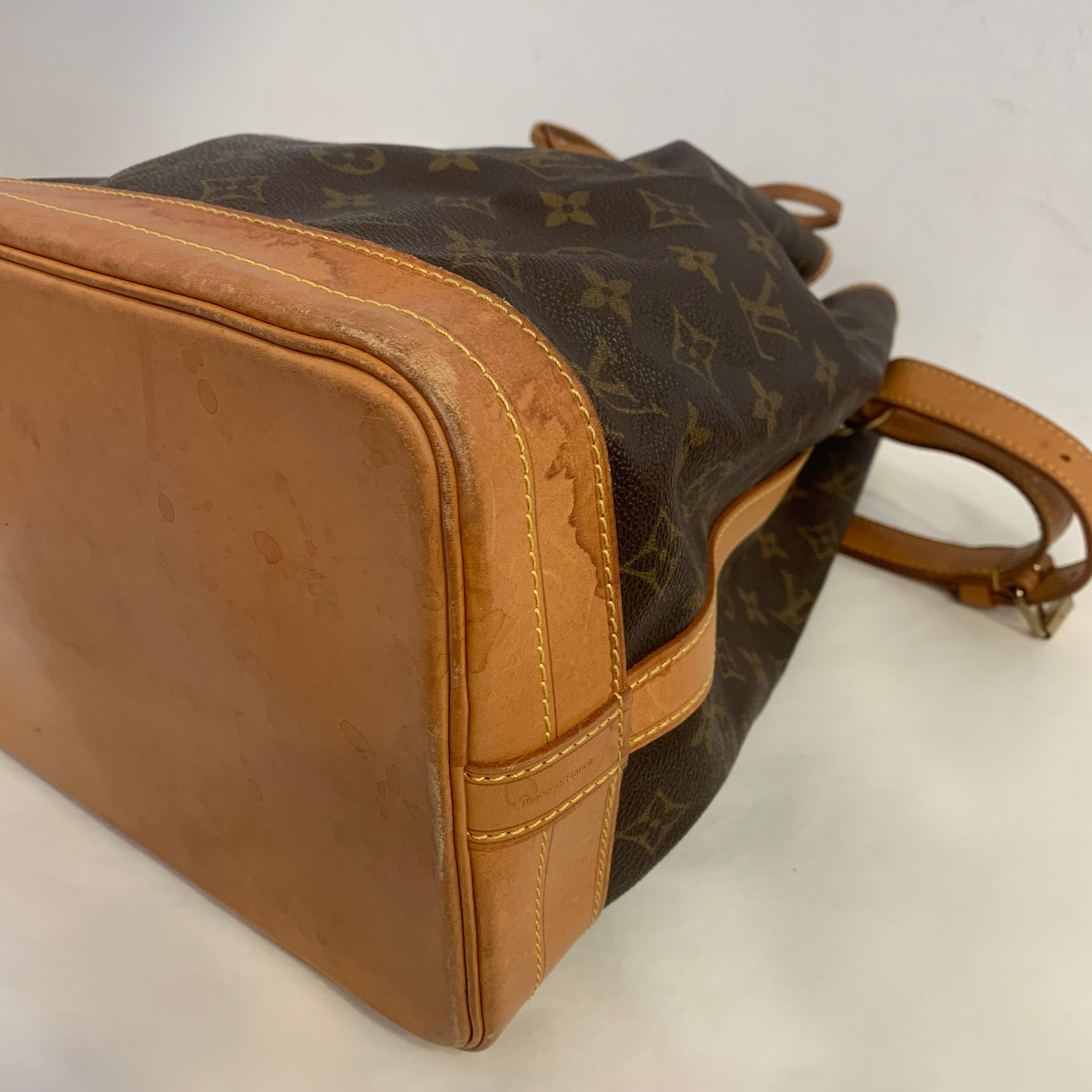The bag is in very good overall condition, especially considering the age of the model and the natural aging characteristics of Louis Vuitton Noé bags. The vachetta leather shows typical water marks consistent with normal use, with only one noticeable mark on the lower front base (as seen in last pictures).